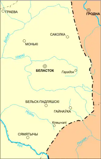 Odległość i obszerny pas puszcz utrudniały Litwinom z Trok zarządzanie ziemiami nad Bugiem, Narwią i Biebrzą, toteż wydzielili oni z województwa trockiego w 1520 roku nowe województwo podlaskie (nazwane tak, gdyż obejmowało ziemie leżące za puszczą wzdłuż granicy Lachów Polaków). Odłączenie tych ziem od województwa trockiego wzmocniło co prawda wpływy mazowieckie, niemniej jednak znad dorzecza Rosi ku dorzeczu Narwi przesuwać zaczęli się intensywnie także osadnicy białoruscy. J. Wiśniewski zauważa, iż ludność osiedlająca się w pobliżu źródeł Supraśli pochodziła ze starych wsi białoruskich, znajdujących się nad południowymi dopływami Rosi[33]. Szczyt zasiedlenia białoruskiego wiązał się z pomiarą włóczną dokonaną po przejęciu w 1524 roku dóbr w Wielkim Księstwie Litewskim przez królową Bonę. W jej wyniku przez blisko 30 lat intensywnie powstawały nowe, duże i zwarte wsie. Białoruski klin osadniczy wcinał się coraz mocniej od Wołkowyska między górną Świsłocz i górną Narew. Do początku XVII wieku białoruskie osadnictwo dotarło do samej granicy Puszczy Białowieskiej, likwidując większą część Puszczy Bielskiej. W I połowie XVII wieku (przed 1634) osadnicy białoruscy znad Świsłoczy zetknęli się po raz pierwszy z ludnością pochodzenia północnoukraińskiego. Obie wschodniosłowiańskie grupy osadnicze zaczęły odtąd podlegać wspólnym procesom narodotwórczym. Niemniej jednak granica między tymi dwoma pierwotnymi masywami osadniczymi – wołyńskim i białoruskim – nie została zatarta do dzisiaj i wciąż może być wyznaczona m.in. za pomocą badań lingwistycznych.