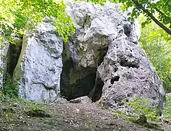- ↑ Marian Czepiel, Schronisko Dolne w Górze II, [w:] Jaskinie Polski [online], Państwowy Instytut Geologiczny – Państwowy Instytut Badawczy [dostęp 2021-09-27].