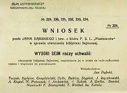 Wniosek posłów klubu PSL-Piast w sprawie utworzenia Biblioteki Sejmowej.