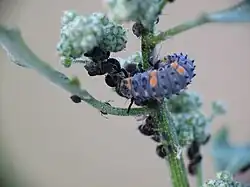 - Biedronka ta odżywia się mszycami, czerwcami, miodówkami i przędziorkami, a także drobnymi larwami motyli i muchówek[5]. Drapieżne są larwy i imago[6]. Dorosła biedronka zjada kilkadziesiąt mszyc dziennie, a larwa zjada do ponad 600 mszyc w ciągu swojego rozwoju[6]. Wśród larw biedronek stwierdzono zjawisko wzajemnego pożerania się[7] (kanibalizm), dotyczy to zarówno jaj, jak i larw.[8]