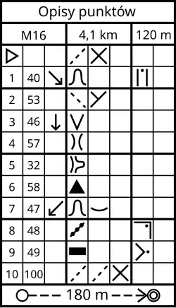 - punkt kontrolny – okrąg o średnicy 6 mm, którego środek dokładnie wyznacza miejsce ustawienia punktu kontrolnego; kolejne punkty są ponumerowane i połączone ze sobą linią prostą,