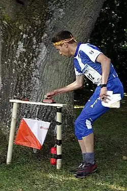 - Drugim, najczęściej spotykanym sposobem potwierdzania obecności zawodnika w punkcie kontrolnym jest system elektroniczny. Zawodnik mając na palcu chip, gdy dobiega do punktu kontrolnego praktycznie nie musi się zatrzymywać, gdyż zapis jest natychmiastowy. Najbardziej popularnym systemem na świecie jest SPORT ident, a w Skandynawii także EMIT.