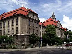 Gmach główny z fasadą od ul. Sixta wzniesiony został w stylu klasycyzującego neobaroku z elementami secesji w latach 1910–1913 wg projektu Ernsta Lindnera przez firmy budowlane Karola Korna i Andrzeja Walczoka. Budynek złożony z trzech brył, z mansardowym dachem i wieżyczką zegarową na szczycie, przypomina architekturę pałacową. Nad wejściem unosi się balkon z czterema dużymi rzeźbami puttów, a elewacja ubogacona jest licznymi emblematami przemysłowymi, m.in. postaciami drwala oraz robotnika z młotem. W latach 1949–1951 dobudowano w tej samej stylistyce skrzydło od strony ul. Słowackiego.