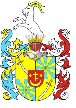 Nad hełmem w koronie baronowskiej pół kozła srebrnego z rogami złotymi.
