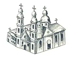 Jest to świątynia dwuwieżowa, wzniesiona na planie krzyża, z trójbocznie zamkniętym prezbiterium i krótkimi ramionami transeptu. Nad skrzyżowaniem naw znajduje się kopuła osadzona na ośmiobocznej podstawie, zwieńczona ośmioboczną latarnią z namiotowym daszkiem. Fasadę zdobią trzykondygnacyjne czworoboczne wieże, których górne kondygnacje łączy szczyt o falistej linii[6].