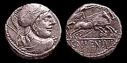 - ↑ Grand Larousse encyclopédique podaje, że bito go od r. 217 do 67 p.n.e. (t. 2, s. 131). Zdaniem większości numizmatyków nie wcześniej jednak niż od ok. 190 r. p.n.e. (C. Rodewald: Money in the age of Tiberius. Manchester 1976, s. 142).