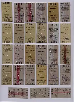 Natomiast pionowa czerwona kreska oznaczała bilet na pociąg pospieszny. Przyjęty był również zwyczaj przecinania na pół biletu wydawanego według taryfy ulgowej[1].