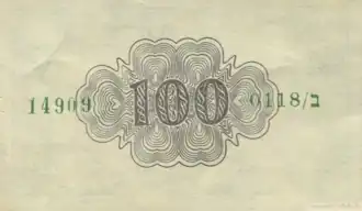 Wycofanie: 22 lutego 1980[10] Seria: b.d. Numeracja: z tyłu, zielona Awers: gilosz, nominał, The Anglo-Palestine Bank Limited (po hebrajsku i angielsku) Rewers: gilosz, nominał, The Anglo-Palestine Bank Limited (po arabsku i angielsku) Kolor: zieleń lub niebieski z zielenią (Awers Rewers) Znak wodny: b.d. Papier: b.d. Wymiary: 75 × 44 mm[1]/70 × 42 mm[6] Nakład: b.d. Projektant: I. David[10] Podpisy: zestaw 1: Minister Finansów – Eli’ezer Kaplan i Główny Księgowy – Mordechaj Zagagi zestaw 2: Minister Finansów – Lewi Eszkol i Główny Księgowy – Awraham Ne’eman zestaw 3: Minister Finansów – Lewi Eszkol i Główny Księgowy – Mordechaj Zagagi Drukarnia: Drukarnia Rządowa (Tel Awiw) | |