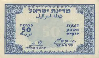 - 1 2 Israel Coins and Medals Corporation, 50 Prutah, Bank Of Israel. Year: 1952, Blue banknote [online] [dostęp 2021-09-16].