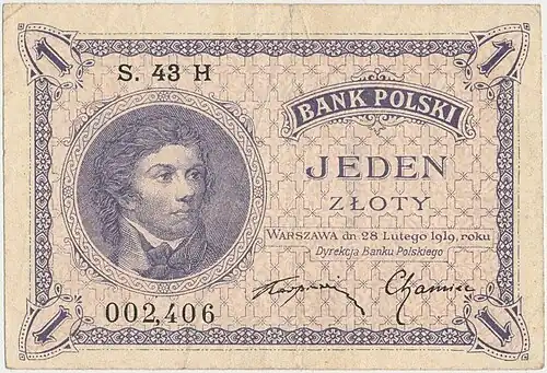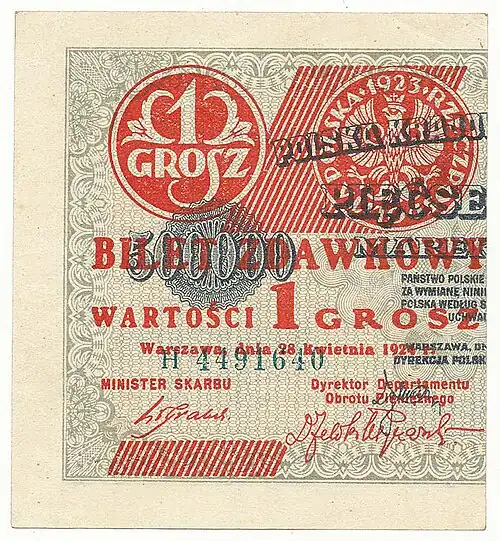 - ↑ Czesław Miłczak, Banknoty polskie i wzory, wyd. Pierwsze, t. I, 1794–1941, Warszawa: Antykwariat Numizmatyczny Paweł Niemczyk, 2012, s. 312, ISBN 978-83-913361-3-7.