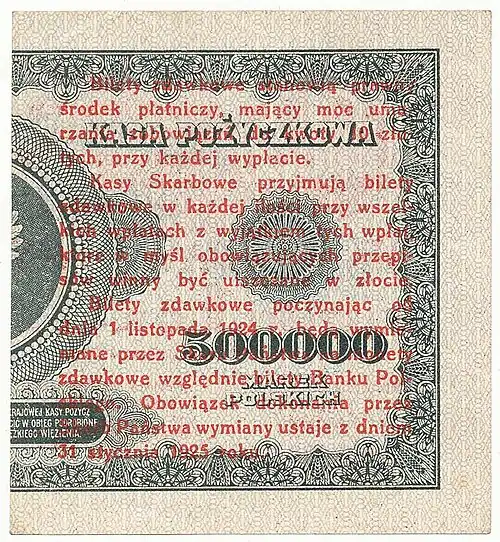 Pojawienie się biletów zdawkowych zaniepokoiło doświadczoną hiperinflacją ludność. Z tego powodu już w październiku 1924 r. ogłoszono ich wymianę na pieniądz metalowy. Z dniem 1 listopada 1924 r. wycofano nominały groszowe, a jedno- i dwuzłotowe (te z napisem Bank Polski) pozostawiono w obiegu aż do 31 grudnia 1925 r[3].