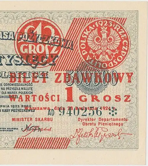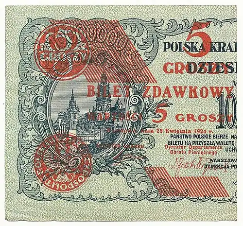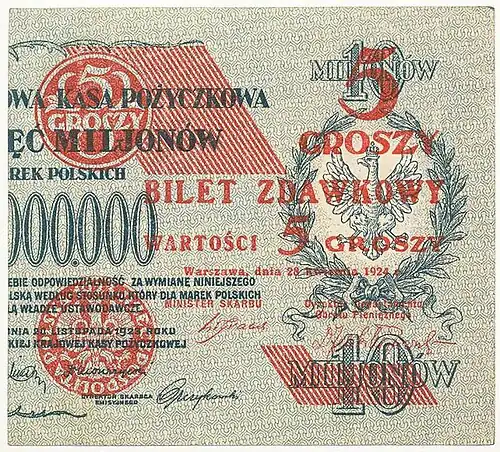 Wg sprawozdania Banku Polskiego za okres od 28 kwietnia 1924 r. do 31 grudnia 1924 r. wprowadzono do obiegu bilety zdawkowe (od 1 grosza do 2 złotych) ogólnej wartości 157 768 060 złotych[4].