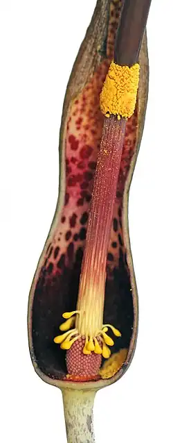 | Arum maculatum, Araceae | muchy gnojówki | zapach uwalnianego skatolu przywabia muchy (z dala od pryzm obornika) |