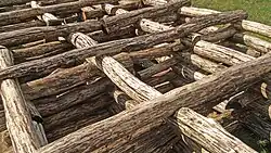 Osada otoczona była skrzynkowym wałem drewniano-ziemnym o długości 640 m, szerokości 3 m, osiągała wysokość 3–4 metrów i posiadała okólną drogę przeznaczoną dla straży grodu[11]. Wejście do osady prowadziło przez bramę wzniesioną z pionowej palisady[11]. Gród otoczony był falochronem o szerokości od 2 do 9 m, zbudowanym z ukośnie wbitych pali.