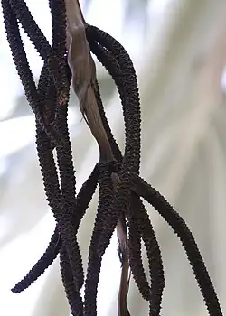 - Drzewo dorasta do 25 m wysokości. Posiada pokrój typowy dla palmy. Kłodzina ma brązową barwę i jest pomarszczona. Ma średnicę około 30 cm[6].