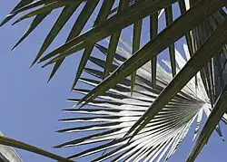 - Wielkie wachlarzowate liście wyrastają ponad prostą kłodzinę. Dorastają do 2,5 m długości. Barwa liści, od zielonego do stalowo-niebieskiego, uzależniona jest od pochodzenia osobnika. Liście są grube i ciężkie. Młode liście posiadają czerwone obwódki[6].