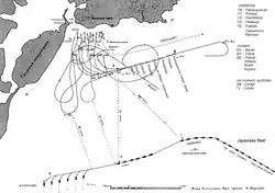 - ↑ Według Dyskant 1996 ↓, s. 55 uzyskano trafienia w „Shirakumo” i „Akatsuki”, chociaż według szczegółowego opracowania Olendra, żaden niszczyciel nie został trafiony (Olender 2021 ↓, s. 175). Należy jednak zaznaczyć, że Japończycy mogli ukryć odniesienie drobnych uszkodzeń.