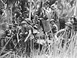 ![]() Patrol z kompanii A australijskiego 2/43. batalionu wysiada z łodzi i kieruje się w głąb lądu, 15 czerwca 1945 | |||