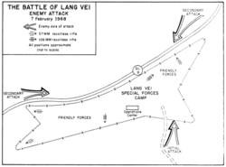 Żołnierze Sił Specjalnych w Lang Vei nadal byli w szoku, gdy 12 czołgów zaatakowało ich obóz. Sowieckiej produkcji czołgi desantowe PT-76 z 203 Pułku Pancernego przetoczyły się przez obronę, wspierane przez atak piechoty 7. batalionu 66 Pułku i 4. batalionu 24 Pułku, oba elementy 304 Dywizji. Wojska lądowe zostały specjalnie wyposażone do ataku w ładunki wybuchowe, gaz łzawiący i miotacze ognia. Chociaż główne umocnienia obozu zostały zdobyte w ciągu zaledwie 13 minut, walki trwały jeszcze kilka godzin, podczas których żołnierze południowowietnamskich sił nieregularnych zdołali zniszczyć co najmniej pięć północnowietnamskich czołgów[75].