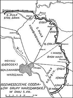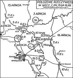 - 15 Wielkopolska Dywizja Piechoty gen. Władysława Junga zajęła pozycje od brzegu Wisły od Falenicy przez Emów do Okuniewa[a]