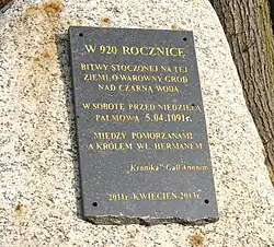 W 2013 r. przy drodze z Drzycimia do Gródka wzniesiono skromny pomnik w postaci kamienia z tablicą upamiętniająca bitwę. Na tablicy jest napis: W 920 rocznicę bitwy stoczonej na tej ziemi o warowny gród nad Czarną Wodą w sobotę przed Niedzielą Palmową 5.04 1991 r. między Pomorzanami a królem Wł. Hermanem. Kronika Galla Anonima. 2011 r. - kwiecień 2013 r. Na tablicy jest błąd merytoryczny, ponieważ Władysław Herman nie był królem tylko księciem Polski, natomiast bitwy nie stoczono o gród nad Wdą (Czarną Wodą), lecz, jak napisano wyżej, była to zasadzka Pomorzan zorganizowana przy przeprawia przez rzekę na powracających z wyprawy łupieżczej Polaków. W kronice Galla Anonima nazwa miejscowości, w pobliżu której stoczono bitwę, jest podana w wersji „Drzu"[1].