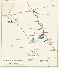 27 sierpnia skoncentrowana w rejonie Sokala 1 Armia Konna Siemiona Budionnego ruszyła na Lublin. W ślad za kawalerią posuwały się dywizje strzeleckie 12 Armii. Stanowiło to duże zagrożenie dla tyłów i prawego skrzydła polskiej 3 Armii[17]. 28 sierpnia oddziały 25 i 7 Dywizji Strzelców sforsowały Bug, uderzając od północy i południu na Dubienkę. Po sześciu godzinach walki 11 pułk piechoty odrzucił natarcie nieprzyjaciela i obronił miasto[21]. 31 sierpnia 25 dywizja powtórzyła natarcie. Tym razem również okazało się ono bezskuteczne. W tym też dniu sowiecka 1 Armia Konna została pobita w bitwie pod Komarowem i rozpoczęła odwrót. Także dywizje strzeleckie 12 Armii zaprzestały działań zaczepnych[17].