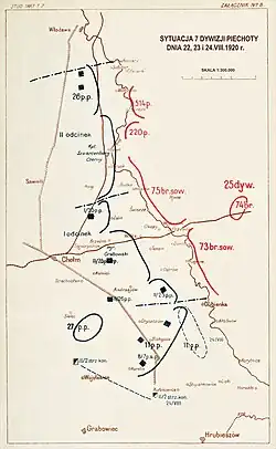 Około południa 8 sierpnia 1920 dowódca 7 Dywizji Piechoty płk Karol Schubert otrzymał od dowódcy 3 Armii gen. Zygmunta Zielińskiego rozkaz opuszczenia linii Bugu. Odwrót rozpoczęto w godzinach wieczornych. Osłaniał 27 pułk piechoty. XIV Brygada Piechoty wycofała się w rejon Chełma, a XIII Brygada Piechoty do rejonu w okolicach Sawina[12].