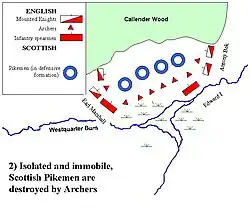 Armia angielska została podzielona przez Edwarda I na cztery kolumny. Dwie, złożone głównie z jazdy i ciężkozbrojnej piechoty, mieli pod swoją komendą Henry de Lacy, hrabia Lincoln i zarazem marszałek Anglii (pomagali mu hrabiowie Norfolk i Hereford) oraz Antony Bek, biskup Durham. Ich zadaniem było wyjść na flanki i tyły Szkotów. Pozostałymi dwiema kolumnami dowodził sam król. Składały się one w większości z walijskich łuczników oraz irlandzkich procarzy, i miały uderzyć w drugim rzucie, wiążąc przeciwnika od czoła[11][10].