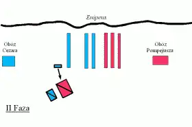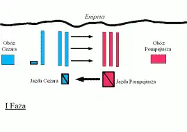 Bitwa rozpoczęła się od ataku dwóch pierwszych szeregów Cezara na główne siły Pompejusza, który – wbrew przyjętym zwyczajom – nakazał bierność własnej piechocie, a rzucił do uderzenia swoją jazdę, licząc, że po odepchnięciu zgrupowanej na prawym skrzydle nielicznej kawalerii Cezara uda się następnie poprzez szarżę z własnego lewego skrzydła zwinąć w kierunku rzeki całą linię przeciwnika, zatrzymaną wzdłuż frontu[1]. Pod naporem wroga, kawaleria Cezara zaczęła się cofać, a podążająca za nią jazda Pompejusza odsłoniła swoją prawą flankę, na którą spadło uderzenie oddziałów piechoty, tworzących rezerwową czwartą linię, pod osobistym dowództwem Cezara. Doszło do zaciętej walki, w której wojska Cezara rozbiły jazdę Pompejusza, zmuszając ją do ucieczki.