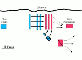 Następnie rozproszeniu uległy oddziały procarzy i łuczników wspierające atak pompejańskiej jazdy, co odsłoniło lewe skrzydło wojsk Pompejusza, na które natarły wolne już wydzielone kohorty czwartej linii. Jednocześnie do ataku ruszyła cezariańska trzecia linia. Zmasowany atak od frontu i na lewe skrzydło złamał opór pompejańczyków, którzy rzucili się do ucieczki w stronę swojego obozu. Cezar, nie przerywając ataku, wpadł za uciekającymi do obozu i zdobył go, a Pompejusz w przebraniu uciekł do Larissy, gdzie wsiadł na statek i odpłynął do Egiptu.