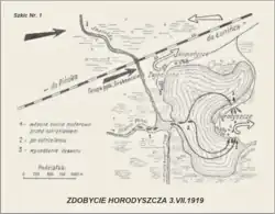 Grupa ta miała odwrócić uwagę dowództwa sowieckiego od marszu na Łuniniec głównego zgrupowania uderzeniowego gen. Antoniego Listowskiego[7]. 2 lipca 1919 roku grupa ppłk. Grabowskiego rozpoczęła natarcie wzdłuż linii kolejowej z Pińska na Horodyszcze – Parachońsk – Łuniniec. Położone na półwyspie między Jasiołdą i jeziorem Horodyskim Horodyszcze obsadzała kompania sowieckiego 64 pułku strzelców. Sowieci do organizacji obrony wykorzystali umocnione drutem kolczastym okopy z czasów I wojny światowej, rozciągające się wzdłuż bagnistego brzegu Jasiołdy. Ukształtowanie terenu sprzyjało obrońcom. Od strony jeziora teren był urwisty i trudny do sforsowania[7].