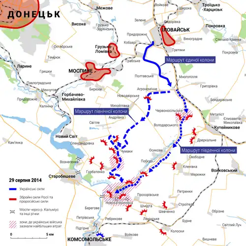 - ↑ Військові у становищі. Як змінилася ситуація на Донбасі. Корреспондент.net, 2014-08-28. [dostęp 2020-08-18]. (ukr.).