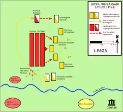 - ↑ Polibiusz podaje jeszcze większe straty: 69 tys. pieszych i około 4 tys. jazdy. Oprócz tego do niewoli poszło 8 tys. pieszych i 2 tys. konnych (Dzieje, III.117, 2 - 4).