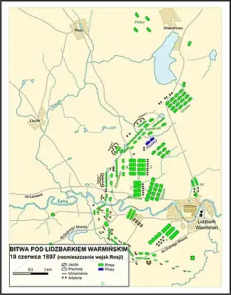 Dogodne ukształtowanie wokół Lidzbarka Warmińskiego skłoniło Rosjan do przygotowania tu systemu fortyfikacji. Ataku Francuzów spodziewano się z południowego zachodu, tu też teren był dogodniejszy do działań defensywnych, przez liczne wzniesienia i las. Umocnienia ciągnęły się tu od rzek Symsarny po Łynę. Znajdujący się tu pas umocnień wysoki na 100–120 metrów, zabezpieczał szańcami drogi wyjazdowe z Lidzbarka. Na drugim brzegu Łyny (lewym), na rozległych równinach przeciętych strumieniami postawiono najprawdopodobniej 3 reduty. 1 i 2 miały po 12 stóp wysokości i ściany grube na 10 stóp. Przy jeziorze Wielochowskim, reduta pozostała niedokończoną. Przy samej Łynie znajdował się szaniec chroniący most, a poza nim jeszcze dwa na równinie. Źródła historyczne są sprzeczne co do ilości redut i szańców, mjr Karl-Friedrich wspomina o sześciu redutach na lewym brzegu rzeki, Petre (najbardziej prawdopodobna wersja) – wspomina o 3 redutach i 3 szańcach, na planie Hoepfnera można doliczyć się razem 7 redut i szańców. Benningsen musiał być gotowym na przerzucenie wojsk przez rzekę, dlatego poza siedmioma mostami w mieście, w Pilniku wzniósł 3 pontonowe.