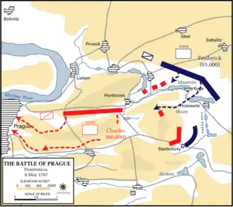 Chcąc uprzedzić uderzenie przeciwnika i zadać decydujący cios głównemu przeciwnikowi w wojnach śląskich, Austrii, 18 kwietnia 1757 r. Fryderyk II na czele swoich wojsk wkroczył do Czech. Wojska pruskie, maszerując w czterech kolumnach liczących łącznie 140 000 żołnierzy, szybkim marszem podeszły pod mury stolicy Czech – Pragi, gdzie napotkały wojska austriackie pragnące nie dopuścić do utraty miasta.