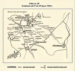 Warunkiem sukcesu było wcześniejsze pobicie 1 Armii Konnej Siemiona Budionnego. Zadanie to miała wykonać 2 Armia gen. Kazimierza Raszewskiego w składzie 1 Dywizja Piechoty Legionów, 6 Dywizja Piechoty, XI Brygada Piechoty oraz Grupa Operacyjna Jazdy gen. Jana Sawickiego i samodzielna 4 Brygada Jazdy[4]. Plan zakładał uderzenie z północnego zachodu Grupy Operacyjnej Jazdy i 6 Dywizji Piechoty w kierunku na Brody - Radziwiłłów[5]. Współdziałająca z 2 Armią grupa gen. Franciszka Krajowskiego ze składu 6 Armii miała wiązać część sił konarmii Budionnego na południowym zachodzie[6].