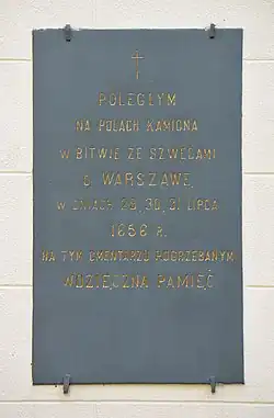 - Tablica umieszczona na fasadzie Konkatedry Matki Bożej Zwycięskiej, upamiętniająca miejsce pochówku poległych żołnierzy, którzy zostali pochowani na przykościelnym Cmentarzu Kamionkowskim.