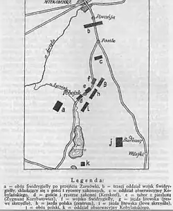 Oddziały polskie pod naczelnym dowództwem Jakuba Kobylańskiego i wspierające je wojska litewskie księcia Zygmunta Kiejstutowicza pod dowództwem jego syna Michała Bolesława po trzydniowym wyczekiwaniu naprzeciw wojsk Zygmunta Korybutowicza zaatakowały go podczas przegrupowania. Po odśpiewaniu Bogurodzicy wojska polsko-litewskie pod dowództwem Kobylańskiego uderzyły na wojska Zygmunta Korybutowicza i Świdrygiełły podczas marszu, wbijając się w ich środek i rozdzielając je na dwie części. Po zniszczeniu tylnych straży, wojska polskie niszczyły kolejne oddziały nieprzyjaciela przybywające na pole bitwy. Następnie wojska Kobylańskiego ruszyły w pogoń za uciekającym przeciwnikiem. Odwodowe oddziały Inflantczyków słysząc o klęsce schroniły się na wyspie na pobliskim jeziorze, która jednak została zdobyta przez Litwinów. Wojska polsko-litewskie rozgromiły tym samym w ciągu tylko jednej godziny krzyżacko-litewsko-tatarskie wojska Świdrygiełły i Kerskorffa, mistrza krajowego inflanckiego. W bitwie zginęli mistrz inflancki, niemal wszyscy komturowie, zakonni rycerze i wielu kniaziów. Do niewoli dostał się ciężko ranny Zygmunt Korybutowicz który wkrótce zmarł. Sam Świdrygiełło ledwie uszedł z pobojowiska do Połocka[1]. Chorągwie zdobyte w bitwie zawieszono w katedrze św. Stanisława w Wilnie.