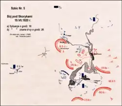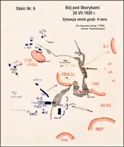 W odpowiedzi, ppłk Witorzeniec, w porozumieniu z dowódcą XIV BP, zorganizował kontratak siłami II/51 pp, wycofanego z przyczółka batalionu 53 pp i II Lwowskiego batalionu etapowego. Tak sformowana grupa, pod osobistym dowództwem ppłk. Witorzeńca, uderzyła o świcie 20 lipca na włamującego się przeciwnika. II batalion kpt. Tyczyńskiego uderzył z zaskoczenia na zgrupowane w okolicach Skoryków oddziały 23 Brygady Jazdy. Jedna kompania uderzyła od Medynia na Skoryki, wiążąc przeciwnika od czoła, a dwie rozwinęły natarcie skrzydłowe od Basówki i Chatek[g] ku wschodowi. Celny ogień prowadzony z broni strzeleckiej i armatki 37 mm nie pozwolił Kozakom na rozwinięcie szarży, a posuwająca się skokami, od jednej pozycji ogniowej do drugiej, polska piechota była nad wyraz skuteczna. Na odgłos ognia od strony Skoryków także II Lwowski batalion etapowy por. Adamskiego przeszedł do natarcia. Współdziałające bataliony wyparły przeciwnika poza linię Staromiejszczyzna – folwark Pieńki[h][33].