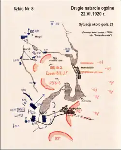 Następnego dnia w rejonie Wołoczysk dowódca 14 Armii komarm. Michaił Mołkoczanow skoncentrował trzy swoje dywizje. Strzelców i kawalerzystów miało wspierać dziesięć baterii artylerii i pięć pociągów pancernych. W sumie zgrupowanie to liczyło około dziewięć tysięcy żołnierzy. W południe rozpoczęło się sowieckie natarcie. Przeciwnik ponownie sforsował Zbrucz pod Wołczkowcem, a zdziesiątkowane i nieuzupełnione od dawna I/51 pp i III/52 pp nie były w stanie mu się oprzeć. Nocą z 23 na 24 lipca Sowieci przeprawili na zachodni brzeg rzeki kolejne oddziały. Walczący na północ od Wołczkowca III/51 pp stracił 40% stanu osobowego. Wsparty kompanią techniczną pułku i 7 baterią 12 pap, nie zdołał jednak powstrzymać nieprzyjaciela pod Worobijówką i cofał się dalej. W zasadzie całe lewe skrzydło XXIV Brygady Piechoty zostało odrzucone znad Zbrucza[34].