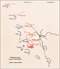 Ugrupowanie bojowe „nowej” 6 Armii przedstawiało się następująco: na północy rozmieszczona była Wołyńska Grupa Operacyjna, a na jej lewym skrzydle, na odcinku od Dąbrownicy do Berezna, operowała 7 Dywizja Piechoty. Korpus Jazdy skoncentrował się na północ od Aleksandrii, a 13 DP rozwinęła się od Aleksandrii do Ostroga i dalej jedną brygadą do Zasławia i Szepetówki[23]. W tym miejscu przebiegała linia rozgraniczenia z Południową GO gen. Latinika. Na styku obu grup w rejonie Szepetówki operowała 1 Brygada Jazdy płk. Janusza Głuchowskiego, dalej na południe, w rejonie Zasławia, 8 Dywizja Piechoty płk. Burhardta Bukackiego, a w rejonie Teofilpola – 5 Dywizja Piechoty gen. Szymańskiego. Południowe skrzydło GO gem Latinika stanowiła rozmieszczona na południe od Bazalii 12 Dywizja Piechoty płk. Januszajtisa. Z polską 12 Dywizją Piechoty sąsiadowały na południu jednostki Armii Czynnej URL. Jej przedni skraj zaczynał się na wysokości Płoskirowa i biegł przez Jarmolińce do Kamieńca Podolskiego i dalej do Dniestru. Odwód 6 Armii stanowiła rozmieszczona w Radziwiłłowie Kubańska Brygada Kawalerii i 6 Dywizja Piechoty stacjonująca w Szumsku[23].