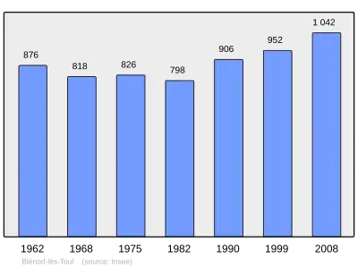 Według danych na rok 1990 gminę zamieszkiwało 906 osób, a gęstość zaludnienia wynosiła 51 osób/km² (wśród 2335 gmin Lotaryngii Blénod-lès-Toul plasuje się na 397. miejscu pod względem liczby ludności, natomiast pod względem powierzchni na miejscu 243.).