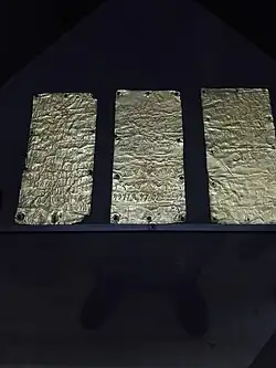 Dwie blaszki (oznaczone jako A i B) zapisano w języku etruskim, jedną (C) w punickim (w dialekcie śródziemnomorskim lub cypryjskim). Mają wymiary ok. 19 × 9 cm[3]. Z treści wynika, że zawierają dedykację króla Cerveteri – Thefarie Velianas, skierowaną do punickiej bogini Asztaret/Isztar (rzymska Junona). Trzem złotym tabliczkom towarzyszyła jeszcze czwarta (z brązu), ale zachowały się tylko jej fragmenty[1][2].