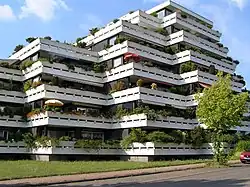 Blok mieszkalny, „Pharao-Haus” („Pyramide”) w Monachium w Niemczech Zachodnich, architekt Karl Helmut Bayer, 1974. Tarasowiec (niem. Terrassenhochhaus)[13].