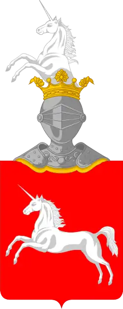 W polu czerwonym jednorożec skaczący srebrny. Klejnot: Pół wspiętego jednorożca srebrnego. Labry: Czerwone, podbite srebrem.