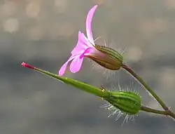 - Osadzone na szypułkach po dwa w kącie liścia wspierającego. Kwiaty o średnicy około 1 cm. Działki kielicha o 3 nerwach są gruczołowato owłosione. Płatki korony karminoworóżowe, odwrotnie jajowate.
