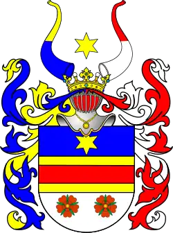 W klejnocie nad hełmem w koronie gwiazda jak w polu pomiędzy dwiema trąbami: z prawej złoto-błękitną, z lewej czerwono-srebrną.