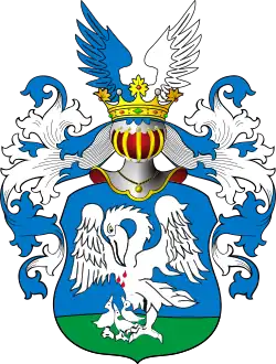 W polu błękitnym, na murawie zielonej, pelikan srebrny karmiący pisklęta krwią z rozdartej piersi. W klejnocie nad hełmem dwa skrzydła orle – prawe błękitne, lewe srebrne. Labry błękitne podbite srebrem.