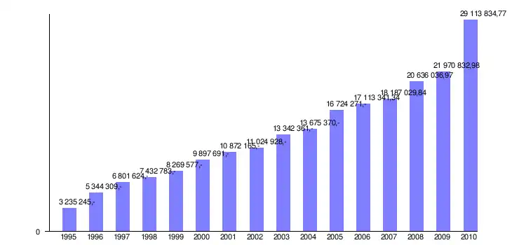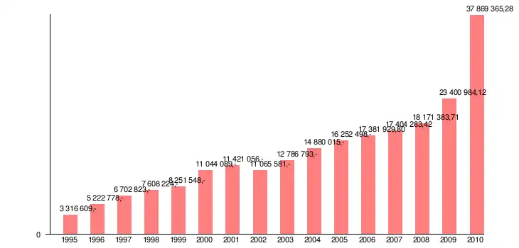 Rysunek 1.2 Wydatki ogółem w gminie Bogoria w latach 1995-2010 (w zł)[3]