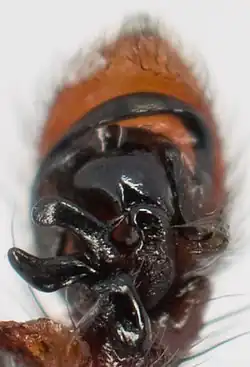 Nogogłaszczki samca mają krótką goleń z dwiema apofizami: ściętą na szczycie retrolateralną i zaopatrzoną w dwa małe ząbki na górnej krawędzi wentralną (brzuszną)[3]. Buławka płciowa samca ma apofizy nieco ku sobie zakrzywione, przypominające cęgi. Apofyza medialna jest podzielona na dwie gałęzie: bazalną i dystalną. Embolus w końcowej ⅓ jest silnie rozszerzony[4], a jego wierzchołek robi jedną pętlę i niekiedy ostro się zakrzywia na lejkowatym wgłębieniu tutaculum[3].